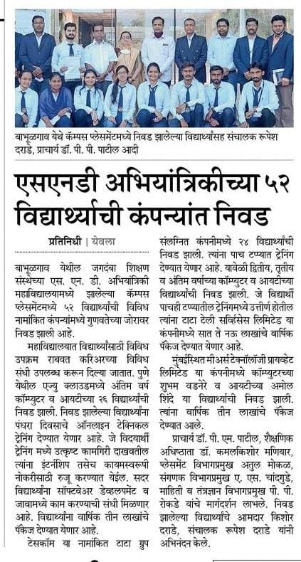 एस. एन. डी” च्या ५२ विद्यार्थ्यांची कंपन्यात निवड – सकाळ २०२२ Share Facebook Twitter Pinterest Linkedin